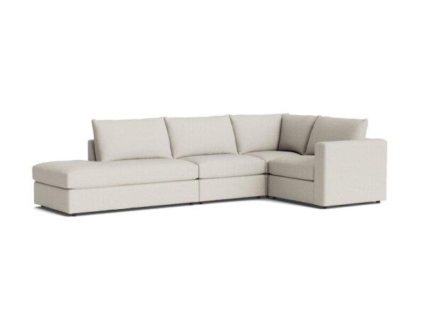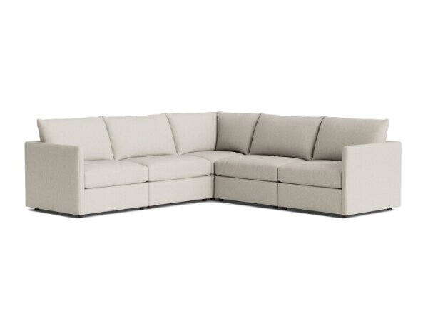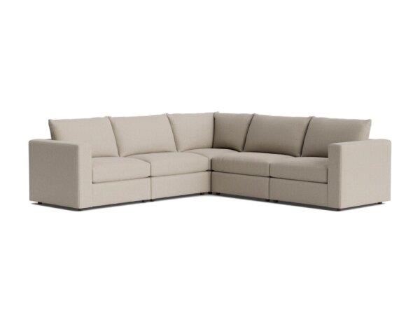 Modular L-shaped sectional with wedge arms, customizable configuration, cushions, and fabric. Top-stitched, welt-less box seats with removable back and seat cushions.
