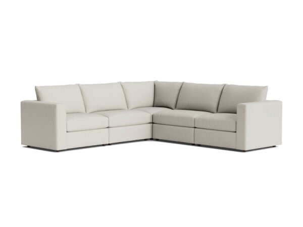 Modular L-shaped sectional with wide track arms, welt-less box seats, and removable back cushions for easy cleaning. 121 in. W x 121 in. D x 38.5 in. H.