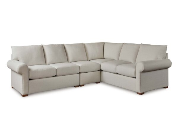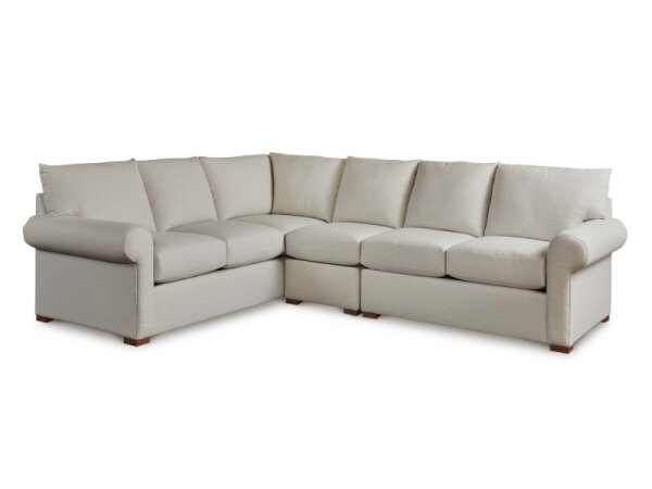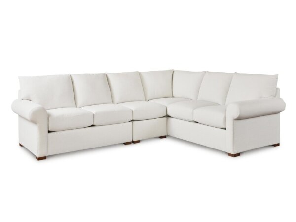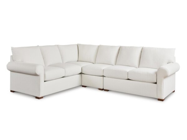 Generous L-shaped sectional sofa with attached pillow-back and top-stitched seat cushions for relaxed, transitional comfort. Fabric upholstery and low-block Brindle legs; 116 in. W x 90 in. D x 37.5 in. H.