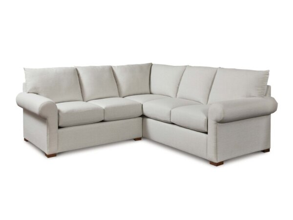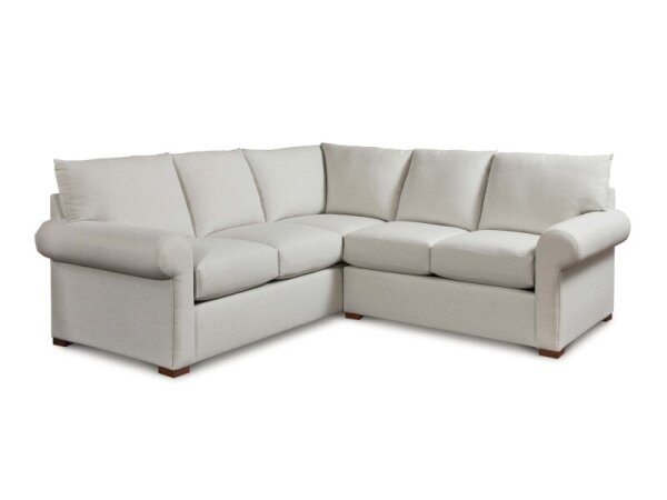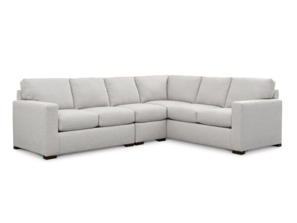 L-shaped sectional with attached boxed back and top-stitched seat cushions for supportive comfort, clean track arms, and low block legs. 113 in. wide for ample seating.
