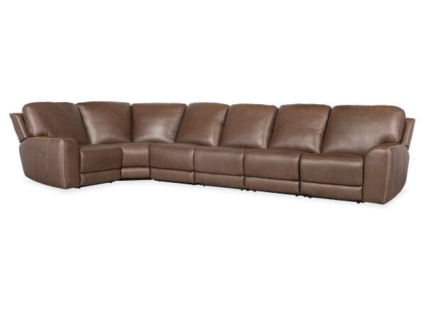 168 1/4" (427.4 cm) SS Living Room Savion Deux 6 Seat Sectional with Three Power Recliners and Seven Power Headrests enriched by Leather design elements, making it a distinctive interior accent.