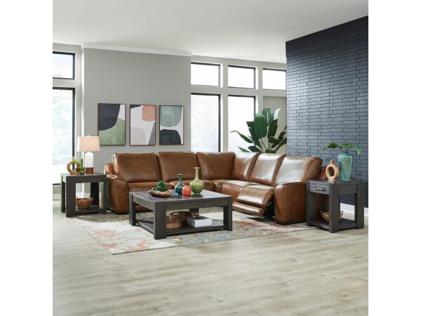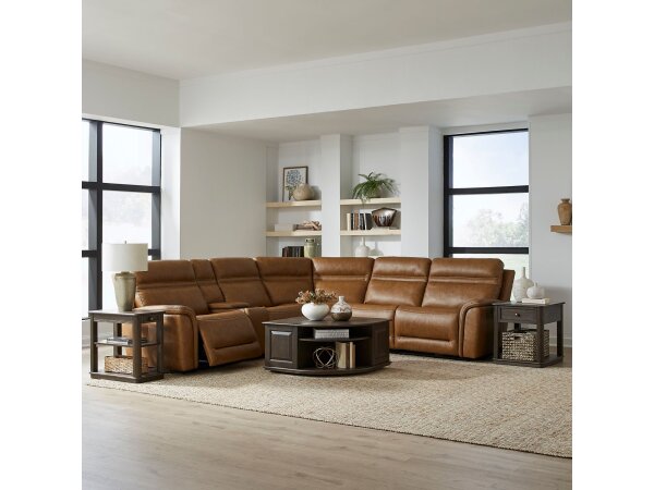 This five-piece sectional includes a dual power zero wall recline feature and a synchronized power headrest for enhanced comfort. It combines a stationary look with motion functionality, finished with decorative welting.
