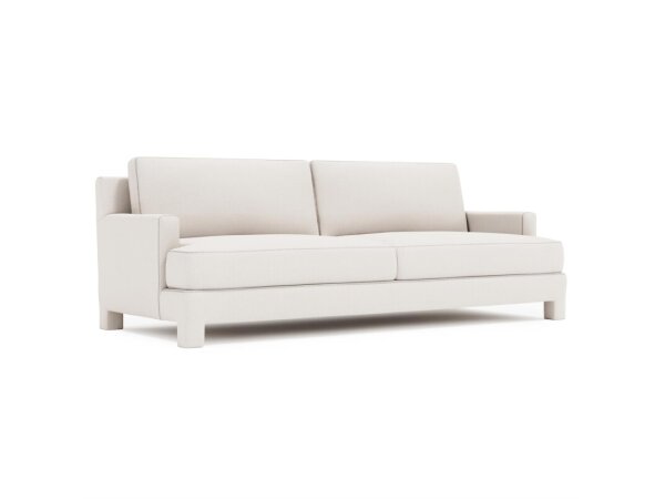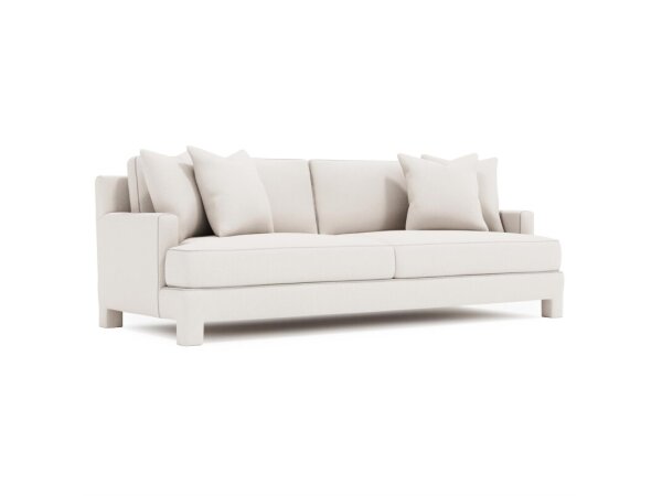 Soft and inviting, this low-profile sofa is fully upholstered in natural fabric and outfitted with plush feather down cushions.