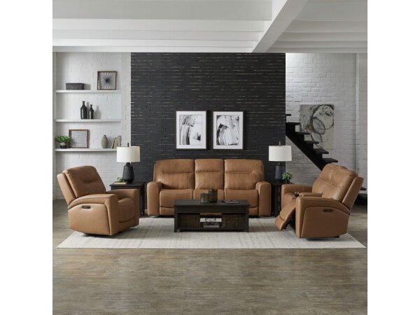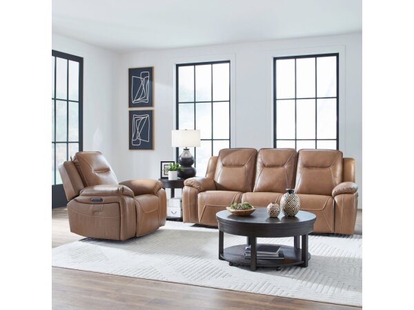 Upholstered in York Butternut leather, this triple power reclining sofa offers a power articulating headrest and powered lumbar support for customized comfort. It also includes heat and massage functions, hidden arm storage, and both USB-A and USB-C charg