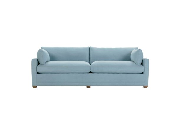 The Sylvie Everyday Denim Sofa provides two back pillows, two seat cushions, and Cloud Down standard cushions for a comfortable seating experience. Deep seating and supportive arms enhance its comfort.