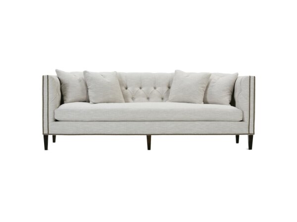 Transitional leather stationary sofa with eight-way hand-tied springs and Spring Down cushions for supportive comfort. Mortise-and-tenon hardwood frame with standard nailhead trim.
