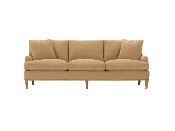 Transitional leather stationary sofa featuring eight-way hand-tied springs and Spring Down cushions for lasting support. Built with a mortise-and-tenon hardwood frame and standard nailhead trim.