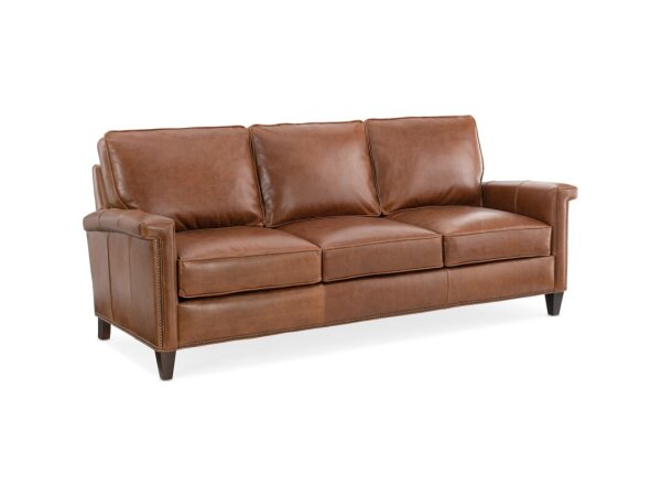 Leather sofa with eight-way hand-tied spring support and Spring Down cushions for resilient comfort. Laminated hardwood frame and transitional style; 88 in. wide.