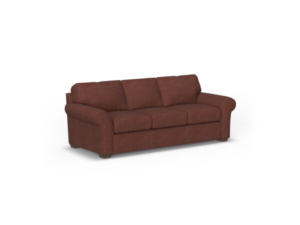 Transitional leather stationary sofa with sinuous spring seating and Spring Down cushions for supportive comfort. Tight bustle back and nailhead trim pair with a standard Mahogany finish.