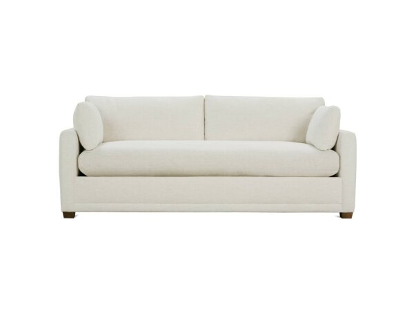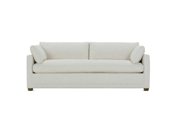 Bench-seat fabric sofa with deep seating and clean track arms for modern comfort. Removable back cushions; artisan crafted in the USA.