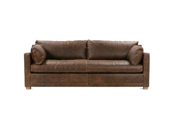 Low-profile leather sofa with large padded track arms and loose cushions that rotate for even wear, set on 2 in. block legs for a modern, grounded look.