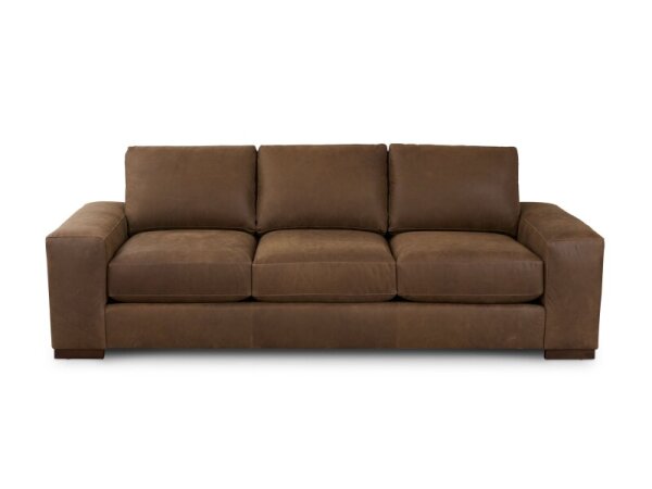 Low-profile leather sofa with large padded track arms and loose cushions that rotate for even wear, set on 2 in. block legs for a modern, grounded look.