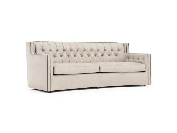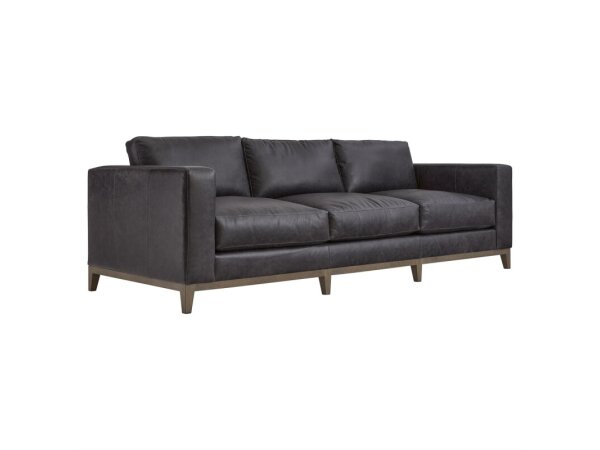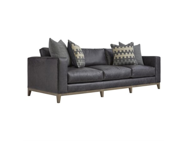 Modern slope-arm fabric sofa featuring a streamlined bench seat and low profile. Wood block legs and removable back cushions deliver clean style and easy care.