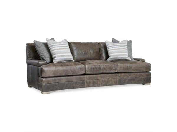 Transitional track arm sofa with attached boxed back and top‑stitched seat cushions for inviting comfort. Low block legs in a Brindle finish; also available as a sleeper with a queen innerspring mattress.