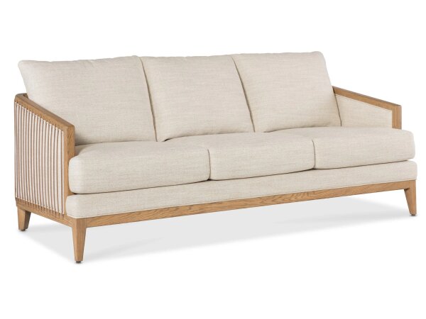 Moderately scaled fabric track-arm sofa with removable back cushions delivers flexible, comfortable seating for small or large rooms. Artisan crafted in the USA; clean lines and tapered legs suit modern living.