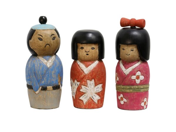 Japanese Three 12in & 10in Set Of Three Carved And Painted Statues