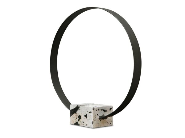 This circular metal sculpture is finished in a brushed satin black anchored by a natural white coral stone base with