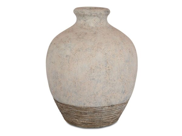Oversized, concrete composite, vase features a rustic casual look with it’s white wash finish and distressed rust brown details on