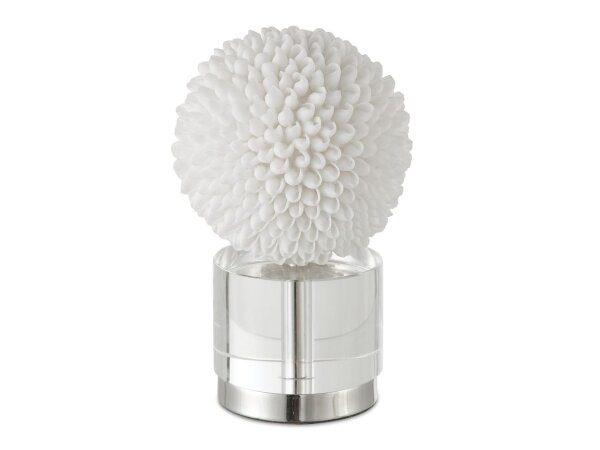 This decorative sphere is handcrafted with faux sea shells, featured with polished nickel plated accents and cylinder shaped crystal base.