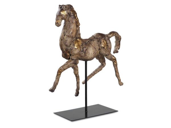 Horse sculpture in aged brown with subtle gold accents on a black iron stand.