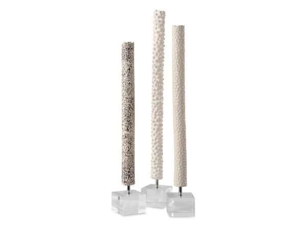 Contemporary trio features solid white marble rings supported by polished chrome rods and an elegant crystal base. Sizes: S-6x15x3, M-6x19x3,