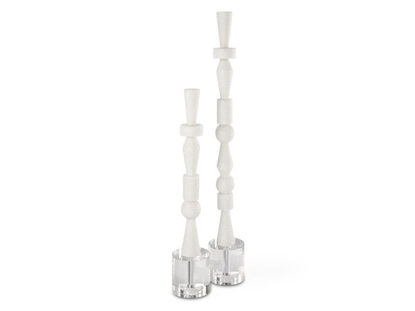 Geometric, stacked totems crafted from ivory man-made stone that accurately replicates the look of Thassos marble and is accented by