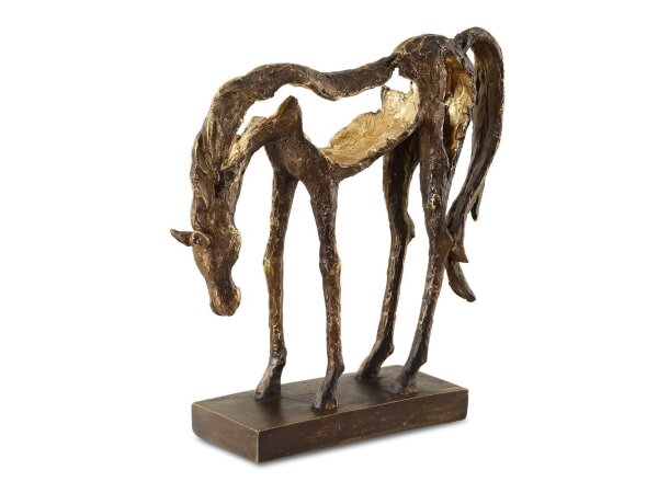Openly sculpted, grazing horse statue finished in a heavily textured, antiqued bronze with dark brown glaze and metallic gold highlights