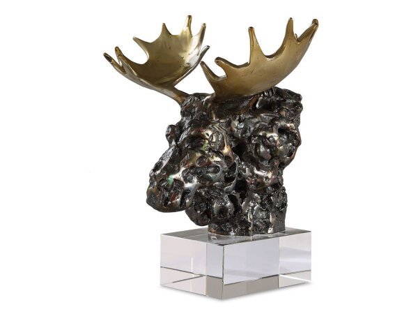 Introducing our exquisite Moose Bust, a majestic symbol of strength and elegance. Crafted in tarnished bronze with gleaming gold antlers,