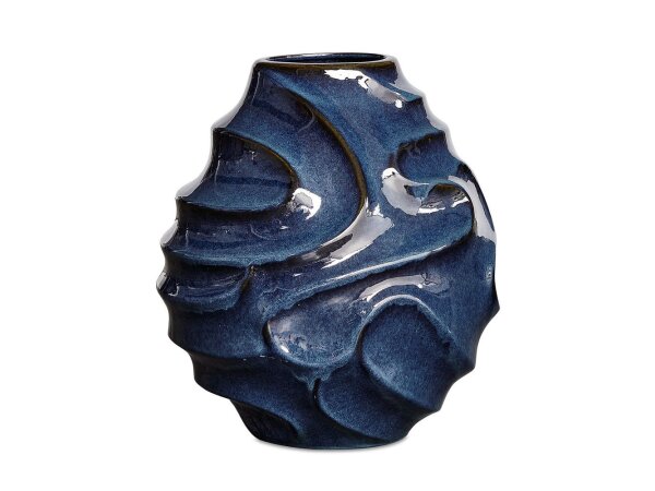A stunning ceramic vase with a deep, glossy blue glaze and sculptural spiral ridges. Its fluid design captures movement and