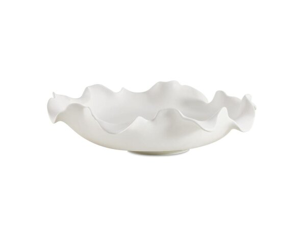 This sculptural white ceramic bowl captivates with its fluid, organic form, reminiscent of ocean waves or delicate petals. A stunning