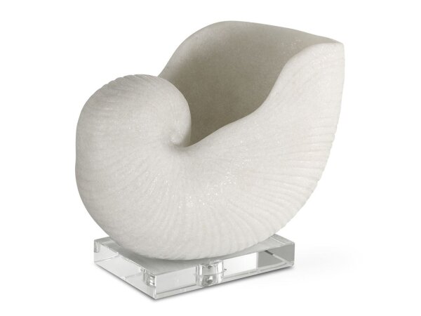 An oversized nautilus shell, crafted from ivory man-made stone that accurately replicates the look of Thassos marble and set on