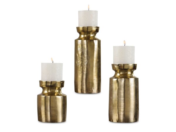 Set of three, textured cast aluminum candleholders feature an antiqued brass finish and completed with three 4″x 4″ white candles.