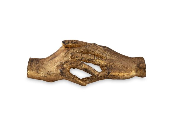 Antiqued gold leaf, cast iron sculpture of hands, forever intertwined, remind us of the comfort and joy physical connection brings.
