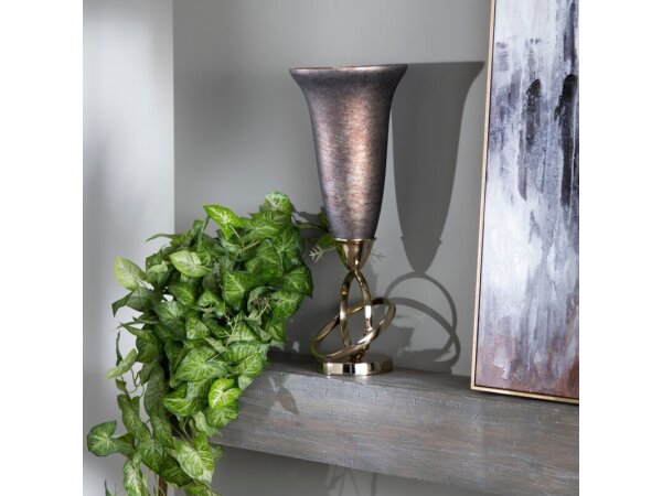 The Crestview Collection Mila Large Urn has a transparent, smoked tulip glass jar with gray aluminum on the round base