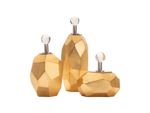 The Crestview Collection Roxy Boxes includes three multi-faceted boxes of varying sizes. Each box features a shiny gold finish so