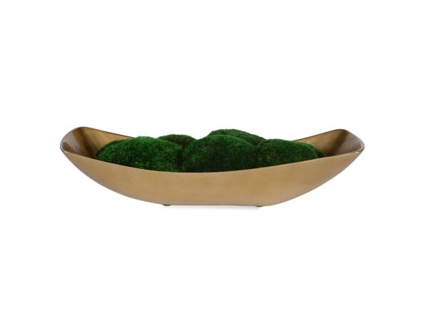 Perfectly preserved mounds of moss are placed together in an elongated boat made of textured cast aluminum finished in antique