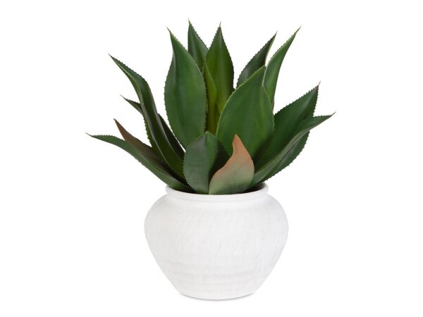 A stunning life-like agave is paired perfectly with an off-white sculptural vase displaying an organic etched texture.