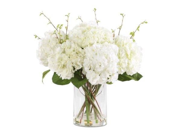 Elegance and simplicity is displayed in the Anastasia hydrangea centerpiece. Lush blooms of cream hydrangeas with natural foliage accents are