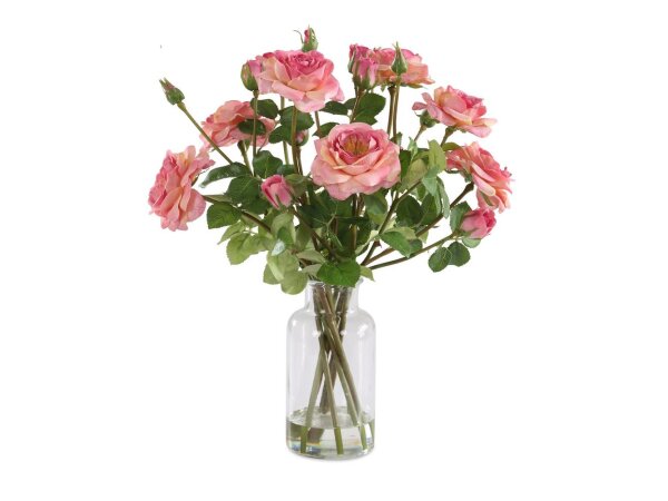 A symbol of admiration and love, refreshing pink toned roses are effortlessly placed into a glass medicine jar with faux