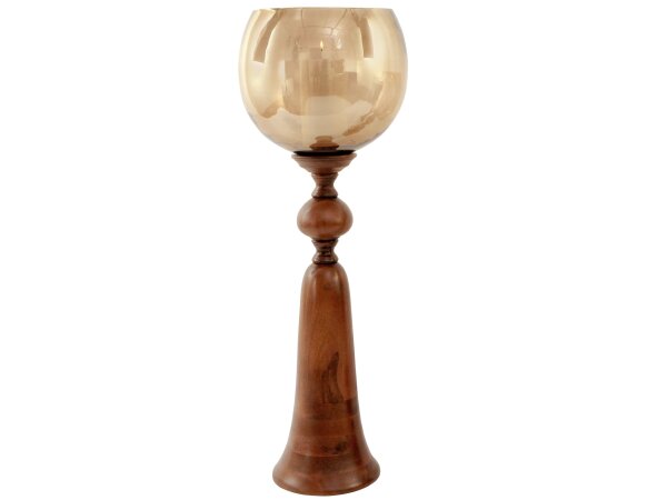 Puri Candle Holder- Large | Natural Brown Finish On Wood With Smoke Glass Globe