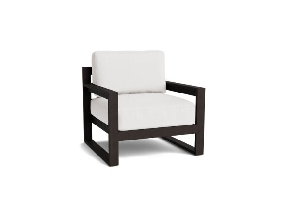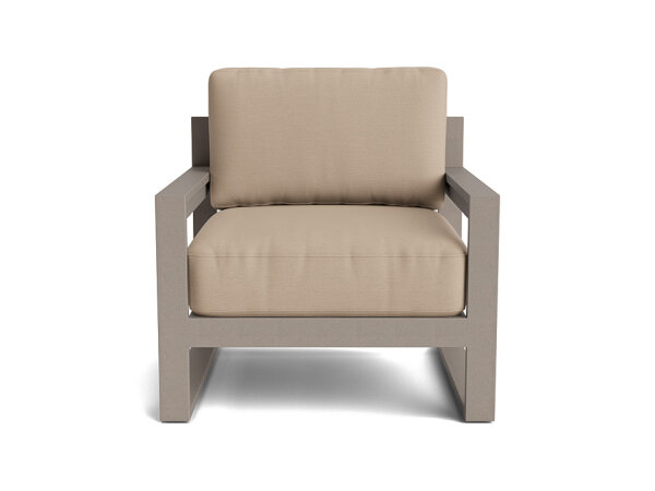 Generously sized outdoor lounge chair with a low, modern back on a sturdy, USA-built aluminum base. Customize the finish and outdoor fabric; removable back cushion and leveling feet aid maintenance.