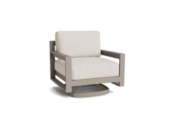 Outdoor swivel rocker with a larger, stable base and a commercial-quality, USA-made aluminum frame. Removable cushions in performance outdoor fabrics and track arms deliver comfortable patio seating.