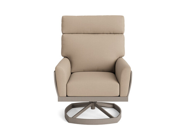 Outdoor track-arm swivel rocker with a wide swivel base and indoor-quality cushions for lounge comfort. Durable, powder-coated aluminum frame with your choice of outdoor fabric.