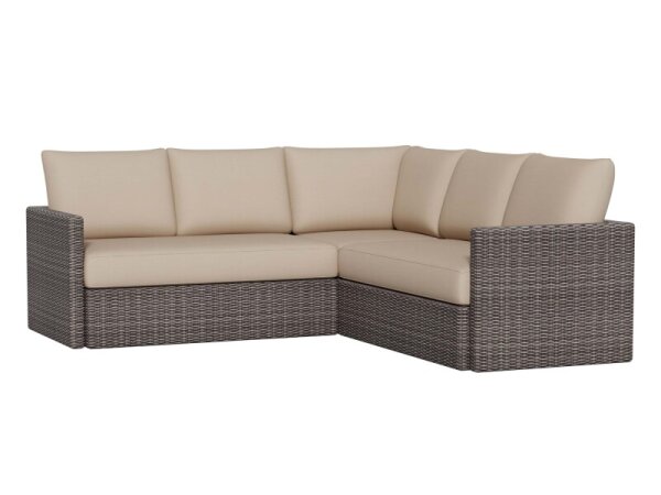 L-shaped outdoor sectional with generous proportions and low, deep seating on a Heathered Grey resin wicker frame over an aluminum base. Choose performance fabrics and cushion comfort; configure in 3-, 4-, or 5-piece layouts.