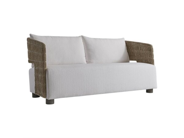 A unique frame in twisted abaca all-weather wicker shapes the arms and back of this outdoor sofa.