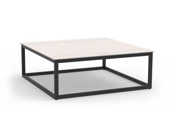 Outdoor rectangle cocktail table with a high-performance aluminum frame and porcelain stone top. 49 in. W x 31 in. D x 16 in. H; leveling feet for stability.