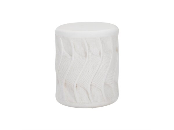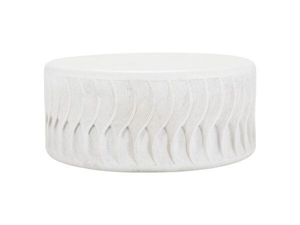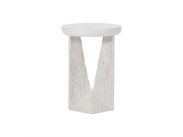 Round outdoor cocktail table with an aluminum base and faux travertine top; spoke-like stretchers add a classic touch. Leveling feet; 42 in. diameter x 16.5 in. H.