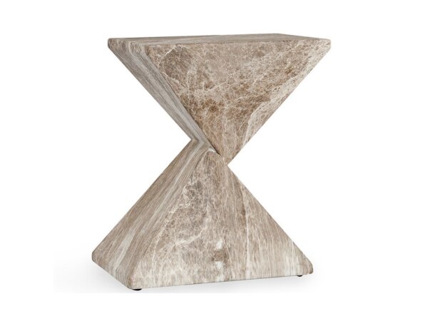 The McKenna End Table features a travertine glass fiber reinforced concrete top with a marble transfer finish, combining durability and
