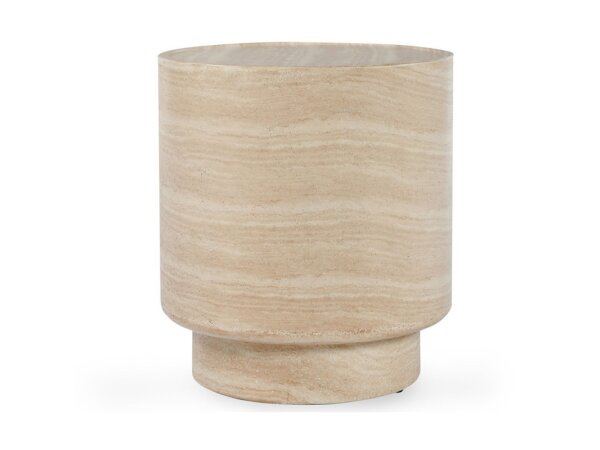 The Rosen End Table features a mix of travertine, outdoor concrete, and glass fiber reinforced concrete, making it durable and