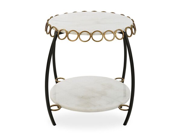 Shelves of honed white marble are decorated with antique gold ringlets with gracefully arched iron legs in matte black. True
